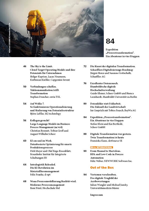 Spannende Beiträge aus der Praxis flankieren die Sicht auf Wirkung und Relevanz digitaler Prozesse. Ob Landwirtschaft, Handwerk, Hochschulbetrieb oder auch die Fertigungsindustrie – Fachbeiträge und Best Practices geben Ihnen einen Einblick in die innovativen digitalen Prozesse vielfältiger Branchen und Unternehmen. Cloud, Low Code und KI sind dabei nur drei der Schlagworte, die die Diskussion um die digitalen Prozesse beherrschen und Ihnen bei der Lektüre der IM+io zum Thema „Digitale Prozesse“ begegnen werden.