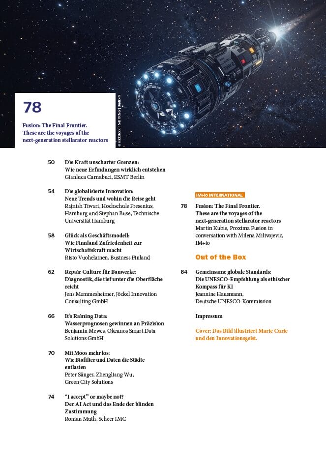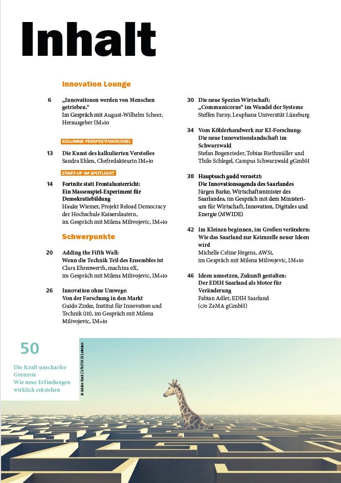 Innovationskultur entsteht nicht zufällig. Sie braucht Räume, die Experimente zulassen, Regeln, die Orientierung geben, und Menschen, die den Mut haben, bestehende Systeme zu hinterfragen. Die neue Ausgabe der IM+io zeigt, wie Innovation heute wirklich entsteht: in virtuellen Spielwelten der Demokratiebildung, an der Schnittstelle von Kunst und Technologie, in Reallaboren des Mittelstands, in globalen Forschungsprojekten und unter neuen regulatorischen Rahmenbedingungen für KI. Anhand konkreter Beispiele aus Wirtschaft, Wissenschaft, Kultur und Politik wird sichtbar, was Innovationskultur trägt – und was sie ausbremst. Welche Strukturen fördern echte Erneuerung? Und wo braucht Innovation bewusst Rebellen statt Routinen?