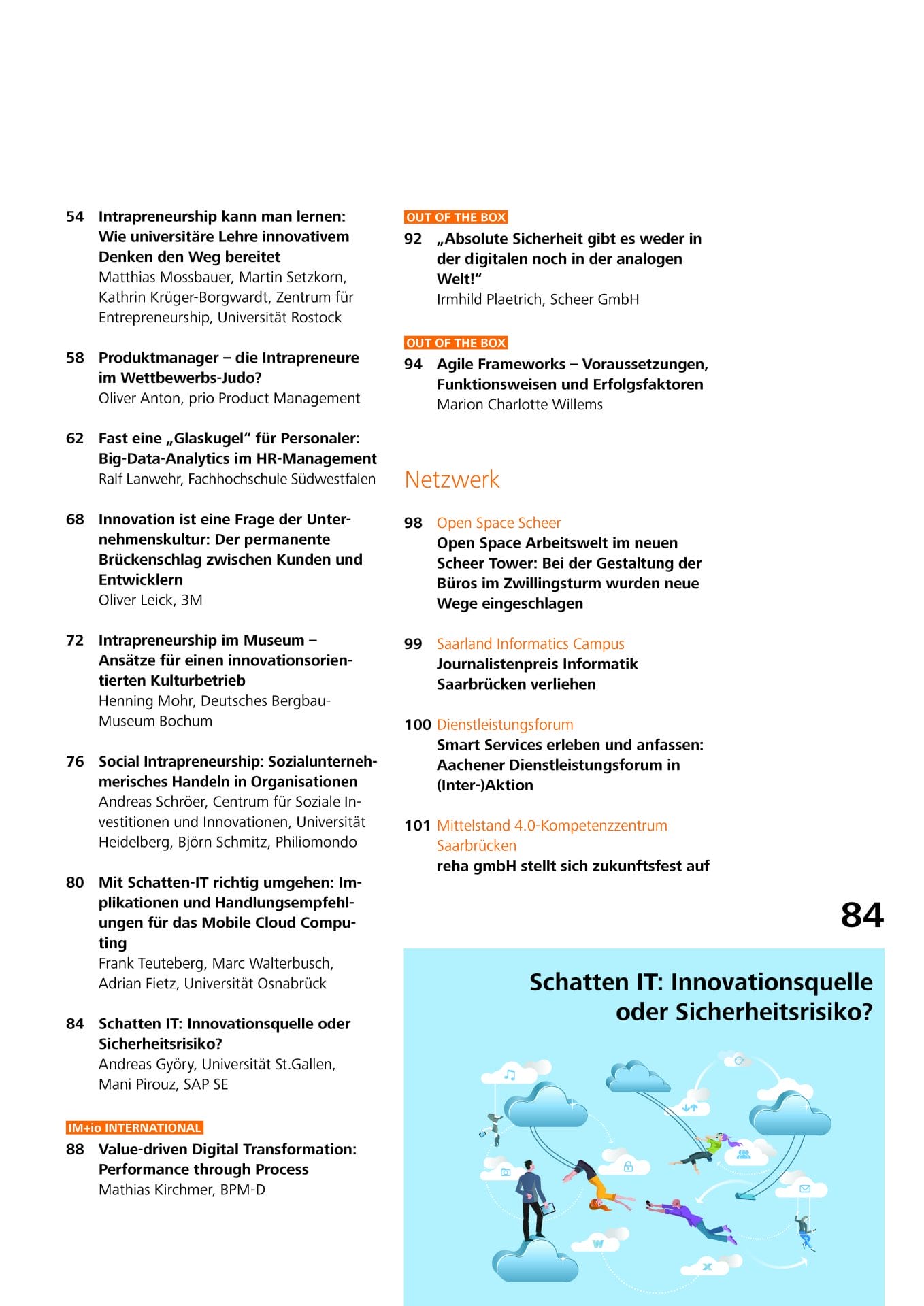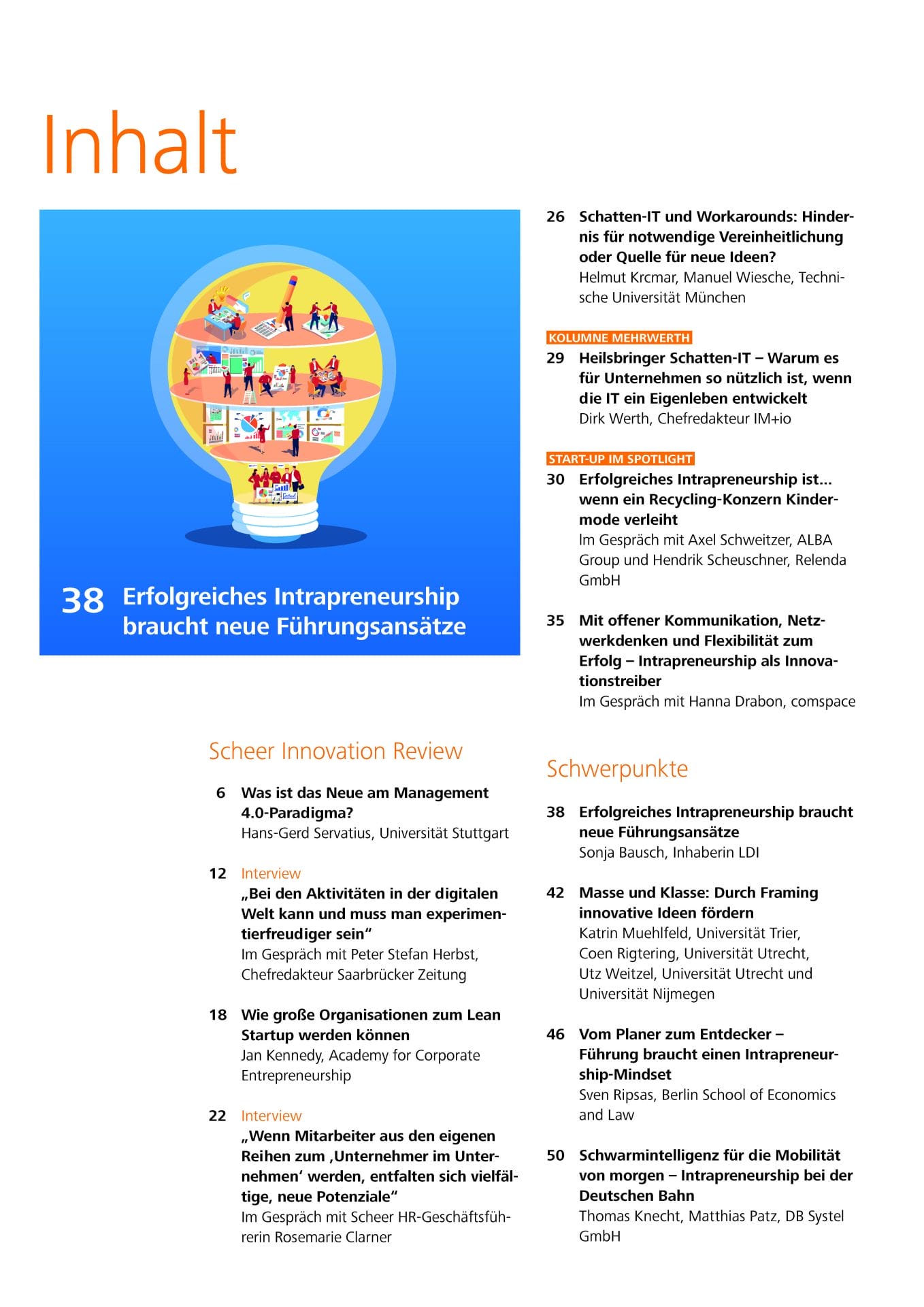 Wie befördern und beschleunigen Unternehmen eigene Innovationen? Welche Impulse kommen dazu aus der Forschung? Schnelle Innovationszyklen erfordern ein Umdenken des Managements. Und Mitarbeiter, die unternehmerisch denken sollen und dürfen, die Freiraum für unternehmerisches Handeln erhalten und damit zu Intrapreneuren werden. Außerdem in dieser Ausgabe: Schatten-IT und Organizational Workarounds entstehen dort, wo ein Unternehmen den Mitarbeitern nicht die adäquaten Ressourcen zur Verfügung stellt. Gerade motivierte Mitarbeiter agieren dann häufig “um ein Problem herum”. Schatten-IT muss allerdings nicht per se schlecht sein.