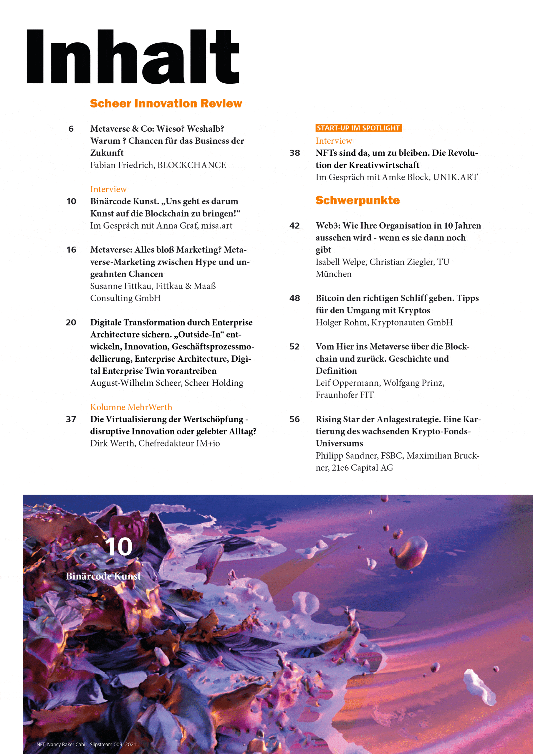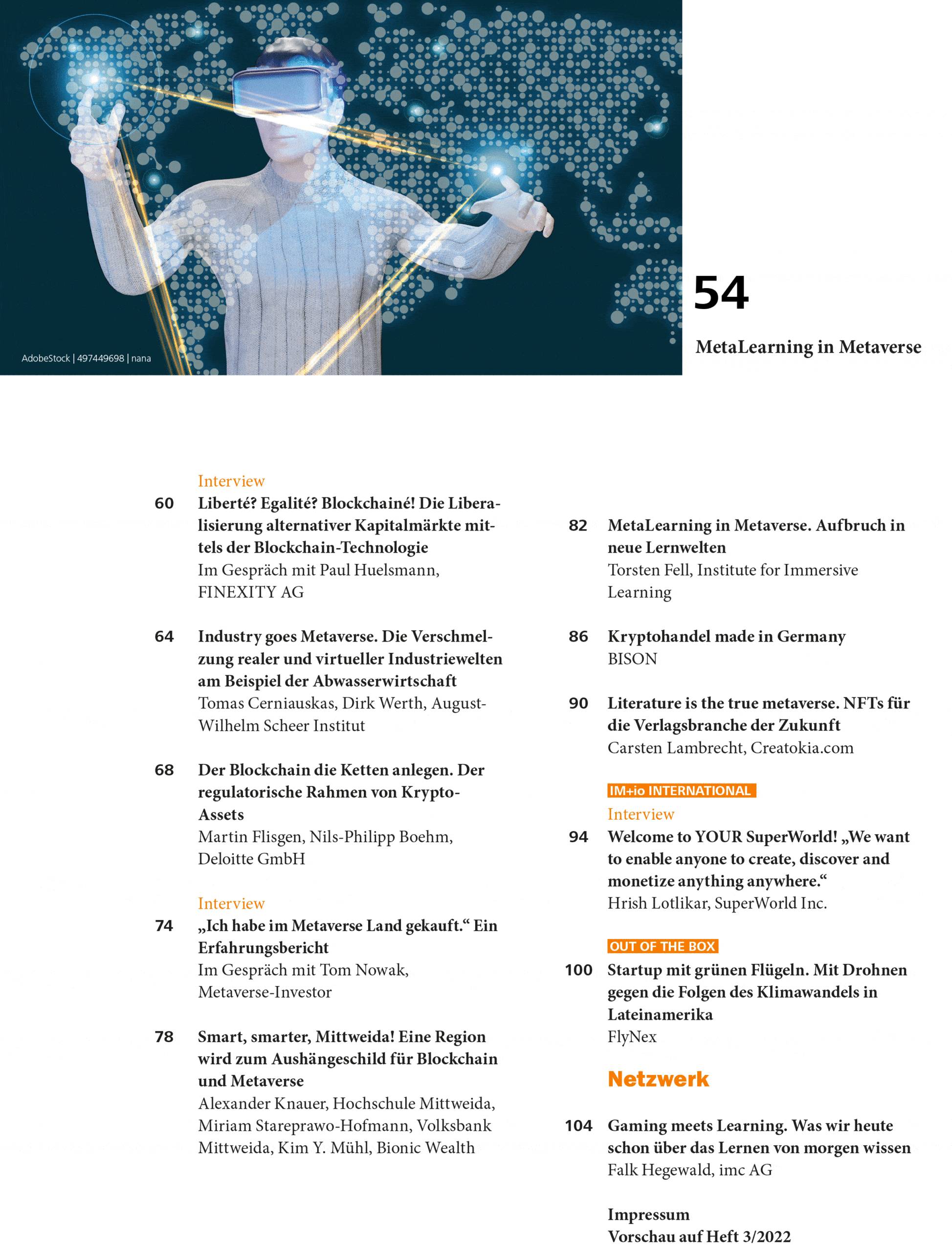 Unsere Zukunft lieg in einem anderen Universum; im Metaverse! Mark Zuckerberg & Co. schwärmen von dieser neuen digitalen Welt. Schier unendlich scheinen die Möglichkeiten des neuen Web 3.0 zu sein: Kryptowährungen schaffen einen sicheren und dezentralen Zahlungsverkehr, der keinerlei Banken mehr erfordert. NFTs revolutionieren die Kunstszene und die Art wie wir Besitz nachweisen. Und im Metaverse bietet sich eine neue Chance digitale Gegenstände zu kaufen und verkaufen, wie zum Beispiel Kleidung und Accessoires für den eigenen Avatar. Aber wie genau funktionieren NFTs und das virtuelle Universum? Wie signifikant ist die Blockchain Technologie? Und wie kaufe ich mit digitaler Währung ein Stück Land in einer digitalen Welt? Die Antworten auf diese und weitere spannenden Fragen erhalten Sie der IM+io mit dem Titel: „Metaverse, NFTs & Cryptos. Die digitale Revolution des Kapitalmarktes“.