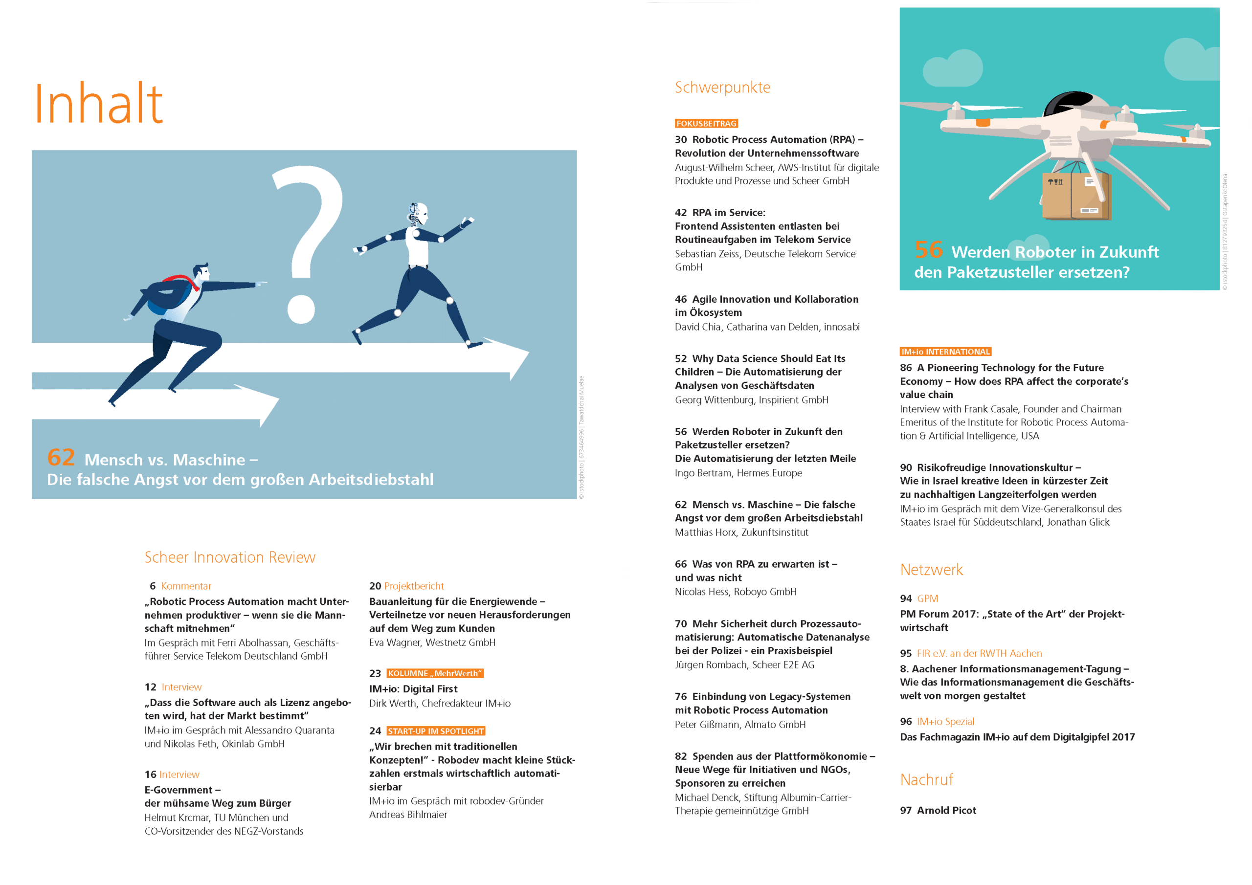 Auch wenn auf dem Cover dieser aktuellen Ausgabe der IM+io ein physischer Roboter zu sehen ist, um unser Titelthema greifbarer zu machen – bei Robotic Process Automation handelt es sich um einen reinen Software-Vorgang. Prozesse der Industrieproduktion, die als „dull, dirty and dangerous“ gelten, werden bereits heute zunehmend durch das Internet of Things und andere Komponenten der 4.0-Industrie automatisiert. Doch auch andere Abläufe im Unternehmen sind oft starren Regeln unterworfen. Software-Roboter setzen hier an und übernehmen bislang insbesondere jene Aufgaben, die, weil klar regelbasiert, standardisierbar, strukturiert und wenig komplex sind.